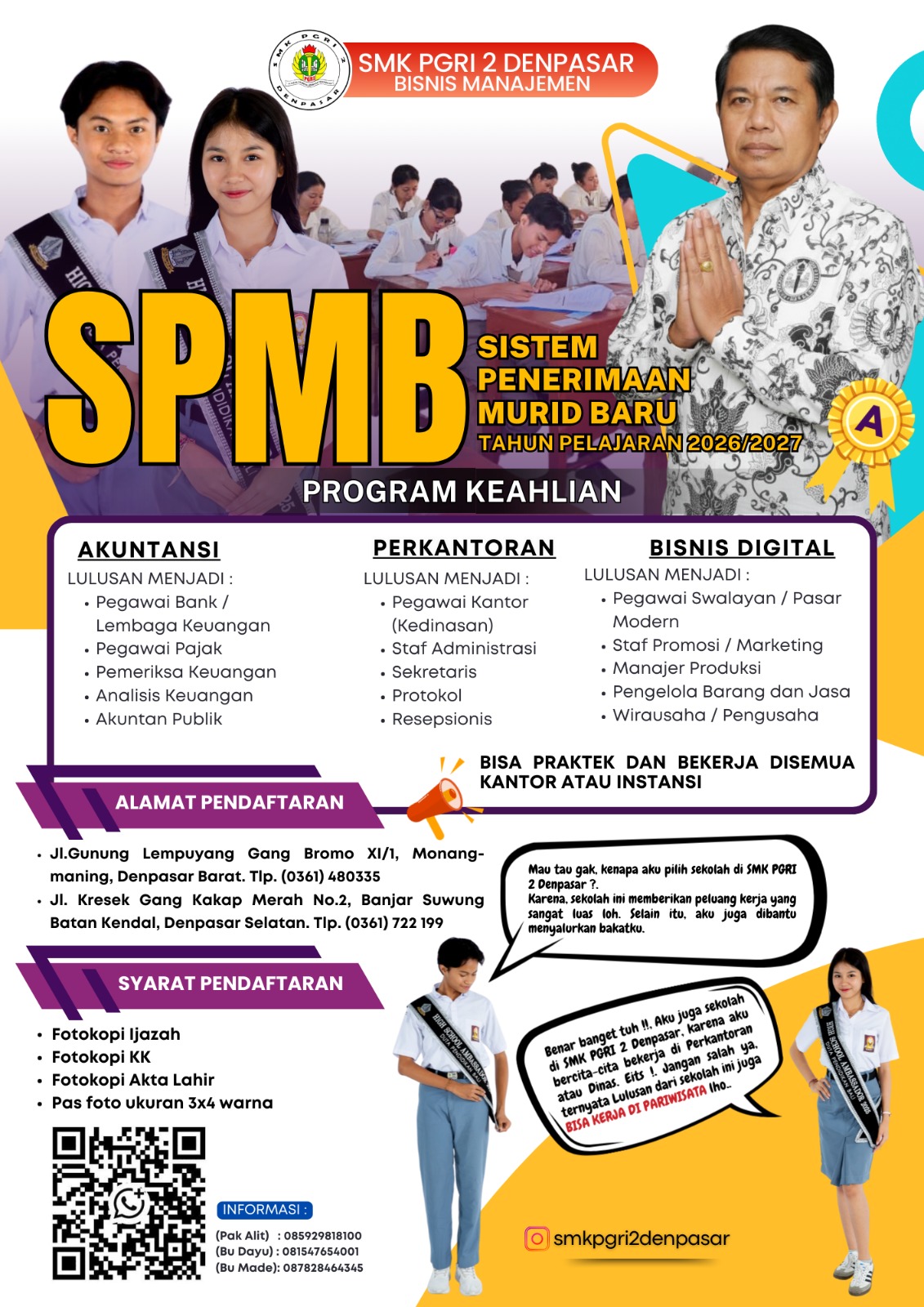 - Datang langsung ke SMK PGRI 2 Denpasar, JL. Gunung Lempuyung, Gang Bromo, No. 11/1, Tegal Kertha, Kec. Denpasar Bar., Kota Denpasar, Bali 80119. Pada jam 07.30 – 18.00 WITA.